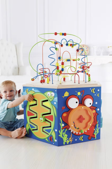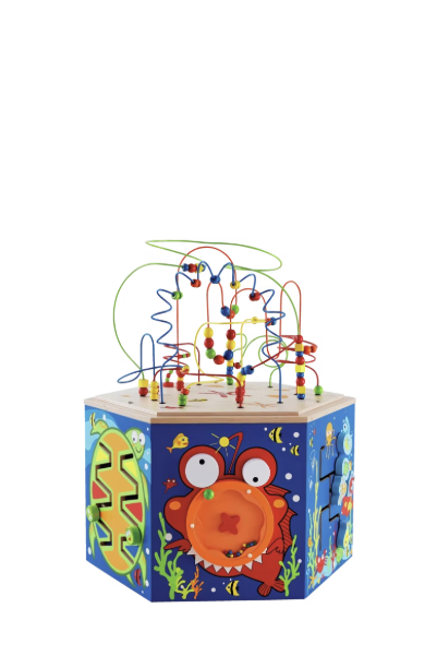 Niveaux, cadrans, engrenages, jeux et labyrinthes créent un océan de plaisir sur ce cube d’activités à six faces sur le thème de l’océan.